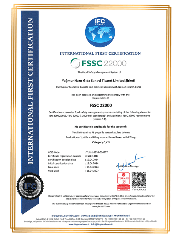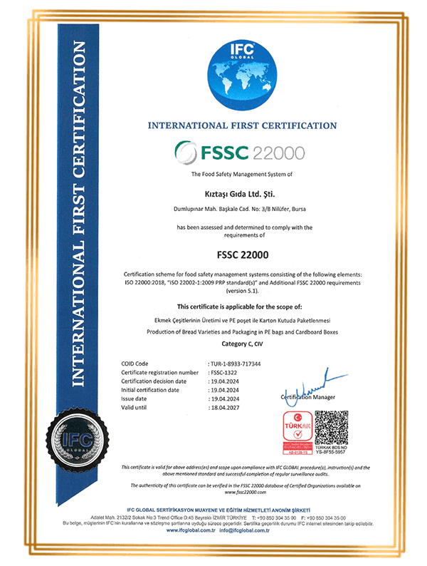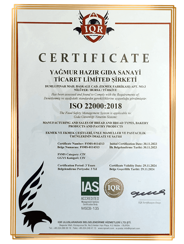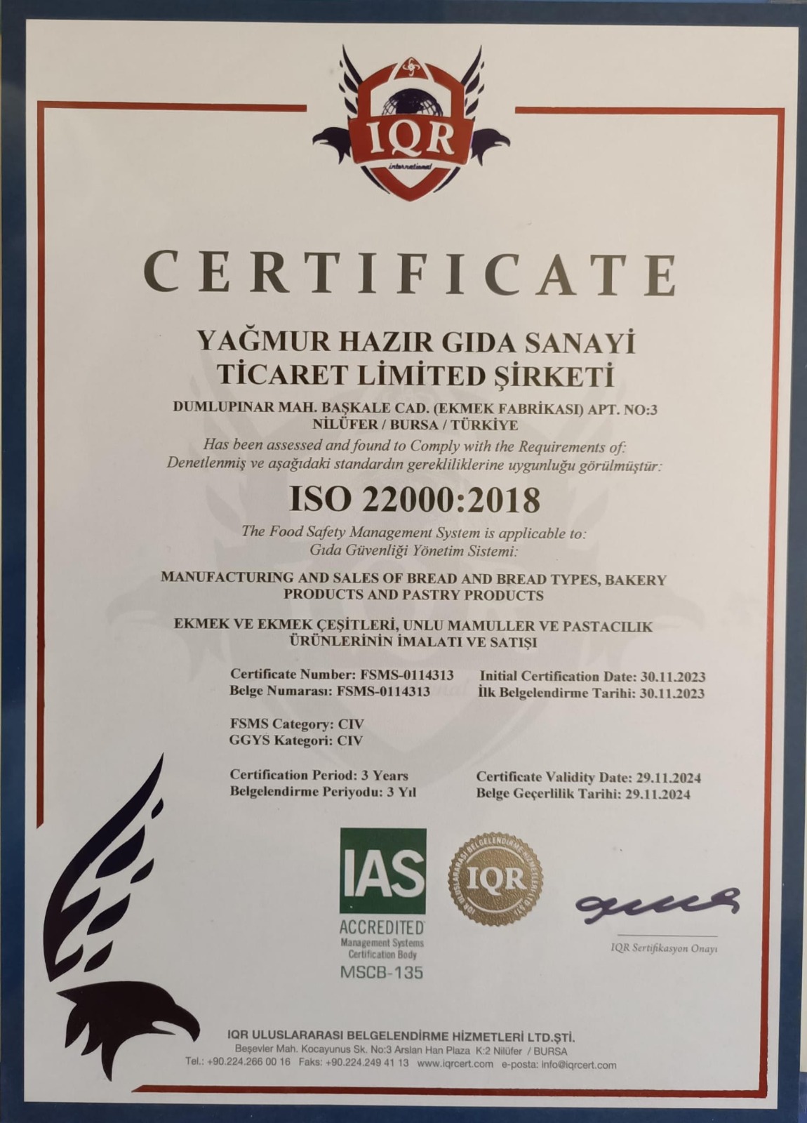 • Uluslararası düzeyde “FSSC 22000”, “HACCP”, “ISO 9001” ve “ISO 22000” standartlarına uygun üretim yapmak,